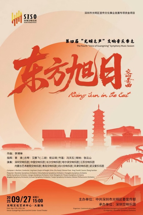 金秋衔晖,华诞盈光。在喜迎中华人民共和国成立76周年之际,由中共深圳市光明区委宣传部主办,深圳交响乐团承办,光明区宣传文化事业发展专项资金资助的第四届“光明之声”交响音乐季于2025年9月27日在光明文化艺术中心·大剧场拉开帷幕,深圳交响乐团联合国内9家交响乐团,成功举行交响套曲《东方旭日》的深圳首演,共有1000多位市民现场观演,线上近60万人同步观看演出直播。