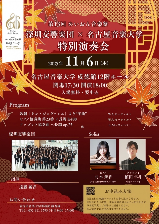 而在11月6日,深圳交响乐团将在名古屋音乐大学举办特别演出,由上海音乐学院作曲指挥系日本籍学生远藤绫音指挥,名古屋音乐大学青年钢琴家村木舞香、大管演奏家植田隼斗与深交合作,演奏莫扎特歌剧《唐·乔万尼》序曲、《A大调第二十三钢琴协奏曲》和韦伯《F大调大管协奏曲》,展开一次交响乐艺术的交流互鉴。