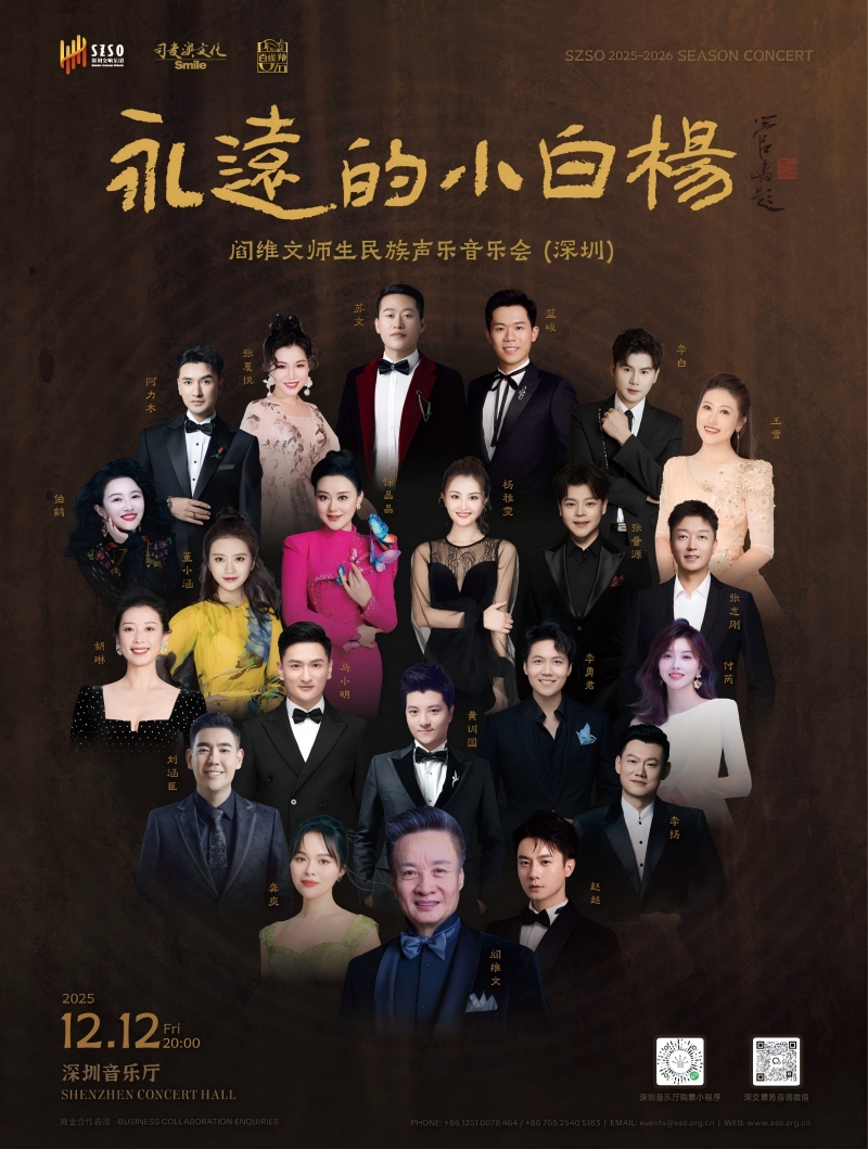 在冬意渐浓的十二月,深圳交响乐团2025-2026音乐季即将迎来一场民族声乐的盛宴——"永远的小白杨"阎维文师生民族声乐音乐会。这场音乐会定于2025年12月12日(星期五)晚20:00在深圳音乐厅隆重上演,由深圳交响乐团与司麦澳(北京)文化艺术有限公司联合主办。作为深圳交响乐团音乐季的重头戏,本场音乐会不仅汇聚了著名男高音歌唱家阎维文及其优秀弟子,更以丰富的曲目和深厚的艺术底蕴,展现中国民族声乐的独特魅力。