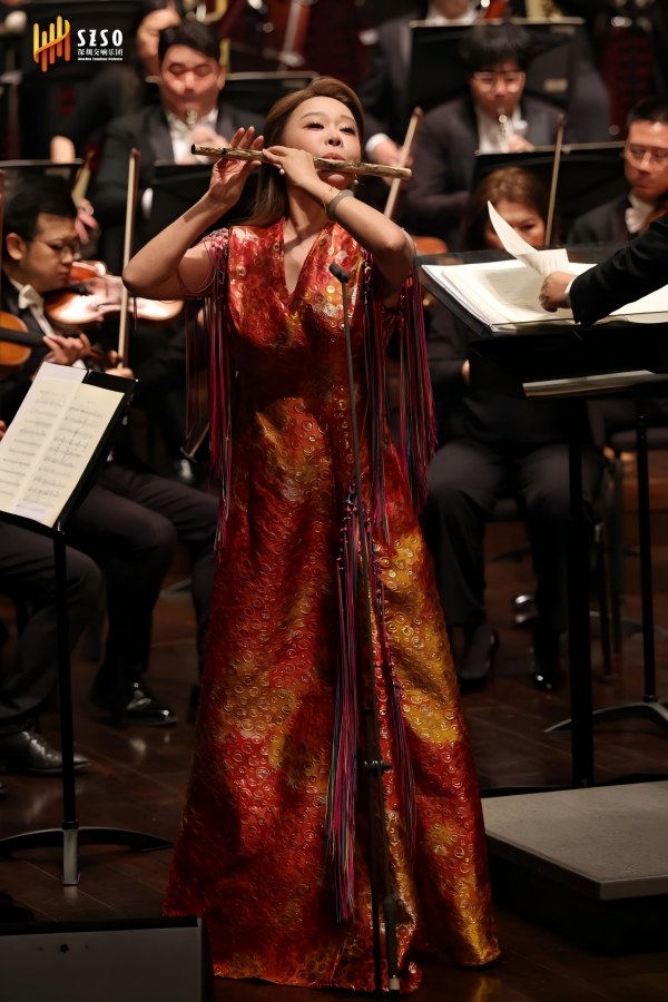 随后出场的是笛子演奏家唐俊乔。她是中国笛箫演奏家中的领军人物,身兼BRAVO国际音乐奖“最佳古典音乐表演奖”获得者、非遗“竹笛艺术”代表性传承人、上海音乐学院博士生导师等多重身份。今晚她演绎周成龙的《挂红灯》,堪称教科书级的范本——那些灵动的装饰音和跳跃的节奏型,在她指尖翻飞出民间吹打乐即兴酣畅的韵味。她的气息绵长而富有变化,在高音区依然保持着圆润如玉的音色,将北方乡村元宵佳节红灯高挂的场景,渲染得栩栩如生。乐队有如助,格外亢奋,弦乐的拨弦与打击乐的欢腾交相辉映,将节庆的氛围推向顶点。