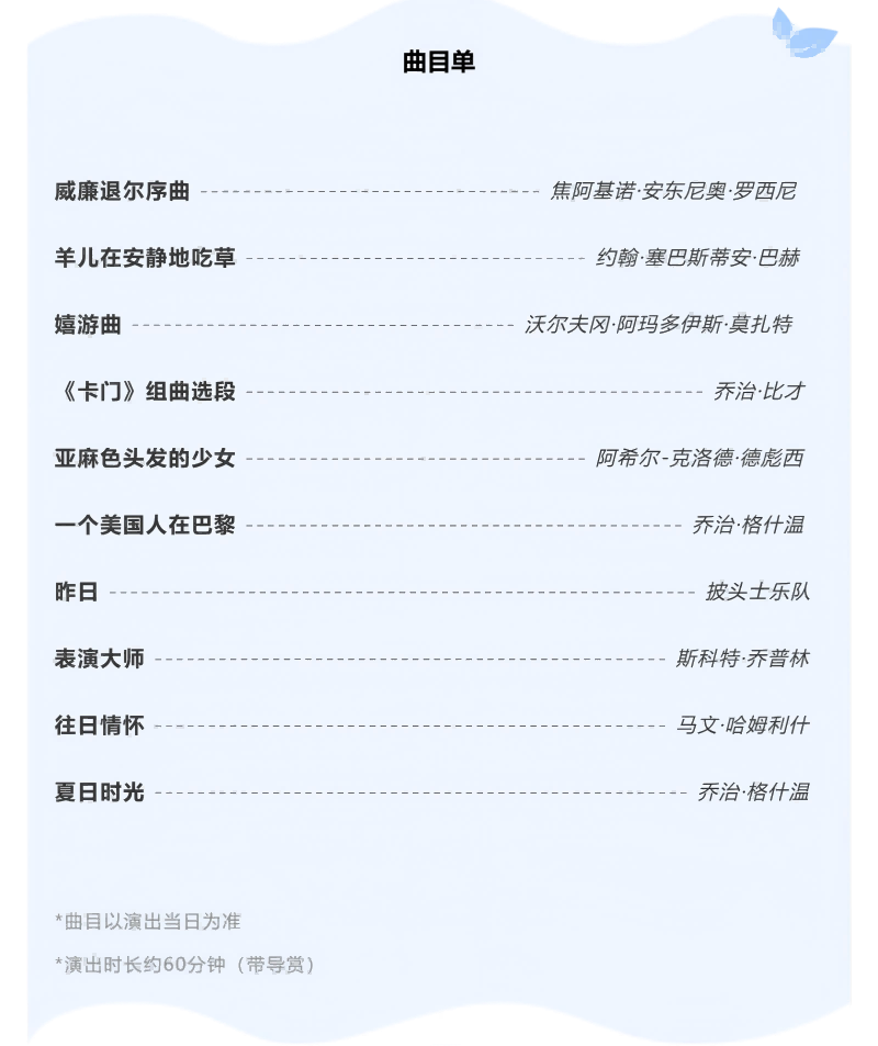 本场音乐会曲目精心编排,兼顾古典雅致与大众审美,既有巴洛克、古典主义时期的传世佳作,也有耳熟能详的流行金曲、影视配乐,风格多元,雅俗共赏。