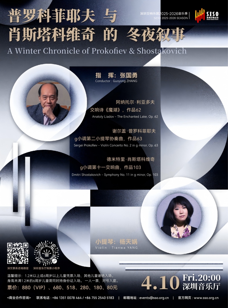 2026年4月10日20:00,深圳交响乐团将于深圳音乐厅呈现《从普罗科菲耶夫到肖斯塔科维奇的冬夜叙事》。本场音乐会聚焦俄罗斯音乐巨匠的对话,由指挥家张国勇与小提琴家杨天娲领衔,以三部经典作品串联20世纪苏俄音乐的技术革新与人文精神。