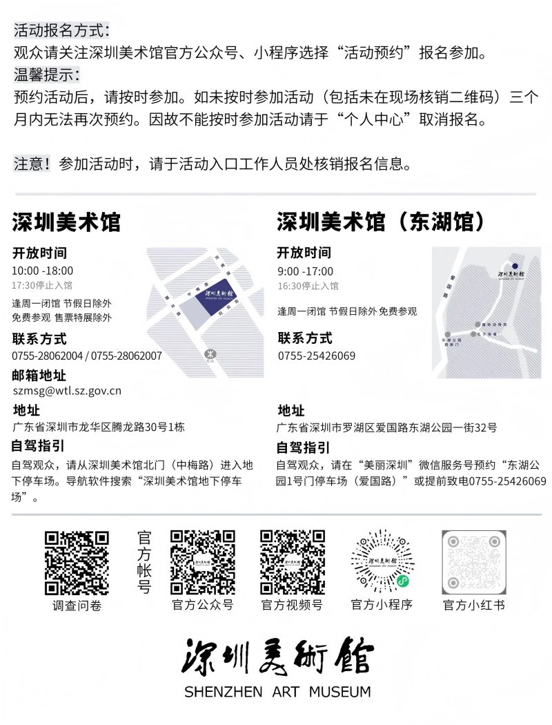 *预约成功如无法按时参加,请在4月30日12:00前取消预约,否则将可能影响您预约其他活动。请珍惜公益资源,报名前请提前规划行程,以免影响正常观演,感谢您的理解与配合。取消预约方式:进入【深圳美术馆】微信公众号后台,点击菜单栏【参观】→【入馆登记】→【活动预约】→ 找到对应订单 → 选择【取消预约】。